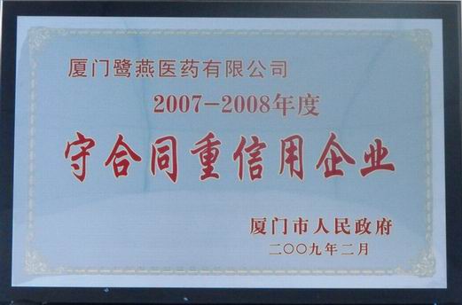 近日,廈門(mén)鷺燕醫藥有限公司、廈門(mén)鷺燕大藥房有限公司在廈門(mén)市工商行政管理局組織的 “廈門(mén)市2007—2008年度‘守合同,重信用’”評比活動(dòng)中榜上有名,這是鷺燕集團旗下子公司繼05-06年度之后再次獲此殊榮。