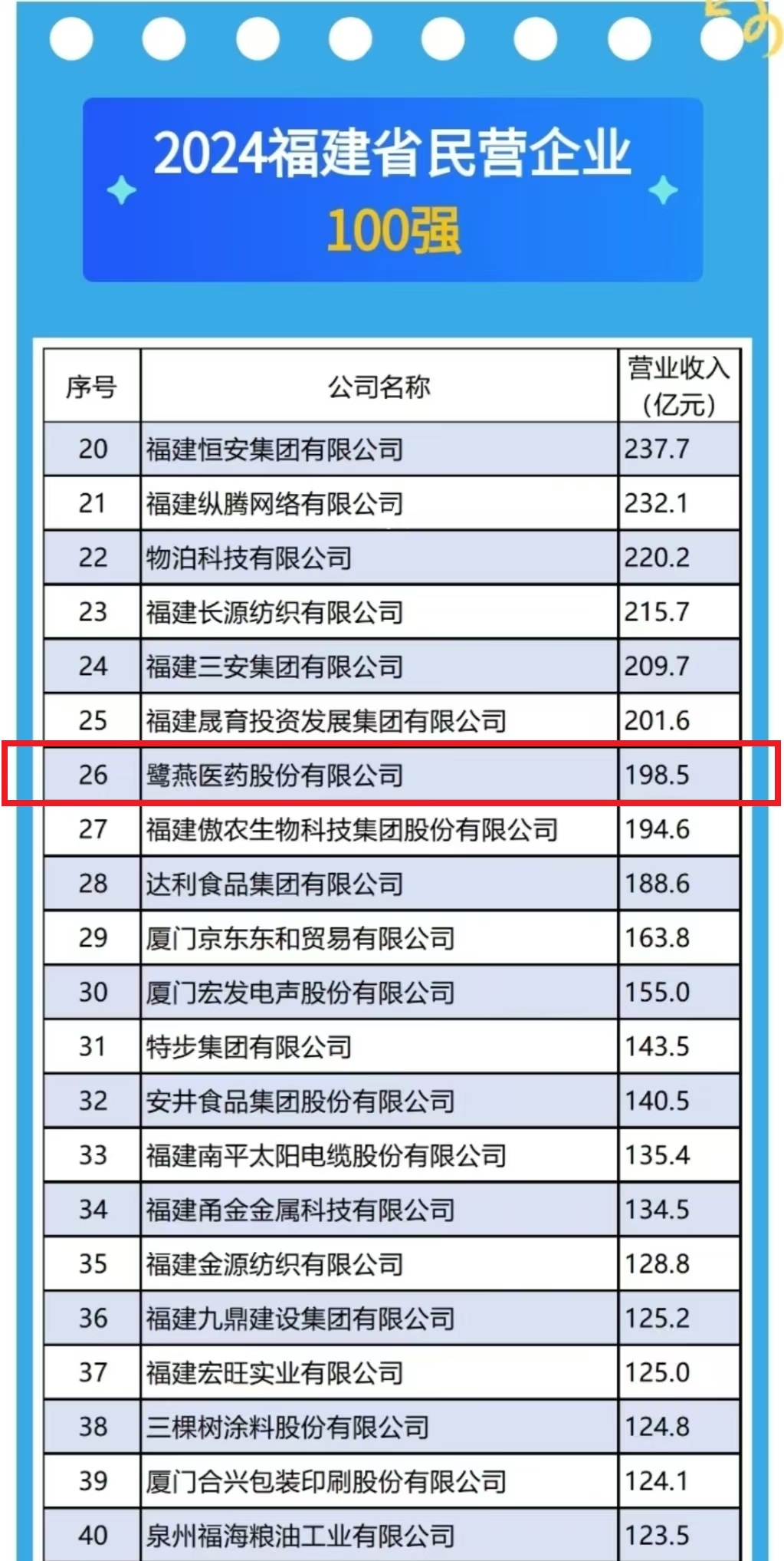 本月,福建省工商聯(lián)發(fā)布2024福建省民營(yíng)企業(yè)100強、制造業(yè)民營(yíng)企業(yè)100強、服務(wù)業(yè)民營(yíng)企業(yè)100強、創(chuàng )新型民營(yíng)企業(yè)100強和民營(yíng)企業(yè)社會(huì )責任100佳5個(gè)榜單。鷺燕醫藥榮獲2024福建省民營(yíng)企業(yè)100強第26位、福建省服務(wù)業(yè)民營(yíng)企業(yè)100強第10位、福建民營(yíng)企業(yè)社會(huì )責任100佳!