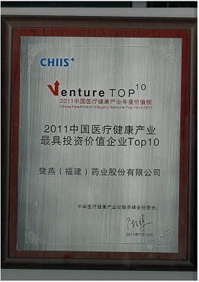 2011年7月14日,在北京舉辦的2011第五屆中國醫療健康產(chǎn)業(yè)投融資峰會(huì )上,鷺燕(福建)藥業(yè)股份有限公司榮獲“2011中國醫療健康產(chǎn)業(yè)最具投資價(jià)值企業(yè)TOP10”稱(chēng)號。公司于2010年引進(jìn)建銀國際醫療產(chǎn)業(yè)基金等投資者近1.5億元投資后,在公司治理、經(jīng)營(yíng)業(yè)績(jì)、戰略布局等方面得到進(jìn)一步提升,鞏固了公司在福建省醫藥流通領(lǐng)域的龍頭地位。