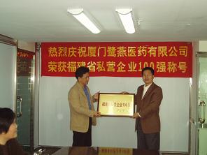由福建省私營(yíng)企業(yè)協(xié)會(huì )、福建日報社聯(lián)合開(kāi)展的2005年度“福建省私營(yíng)企業(yè)100強”評定活動(dòng),于近日揭曉最終入圍企業(yè),廈門(mén)鷺燕醫藥有限公司榜上有名。今天,市工商局的領(lǐng)導來(lái)我司進(jìn)行了授牌儀式。儀式上,吳金祥總裁向領(lǐng)導們介紹了鷺燕的成長(cháng)歷程,并對將來(lái)的經(jīng)營(yíng)進(jìn)行了展望。領(lǐng)導們在聽(tīng)取了吳總裁的匯報后,肯定了鷺燕的發(fā)展模式,同時(shí),也對鷺燕的可持續發(fā)展提出了許多有益的建議。