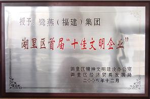 據悉,在湖里區文明辦開(kāi)展的文明企業(yè)創(chuàng )建活動(dòng)中,鷺燕(福建)集團有限公司榮膺湖里區首屆“十佳文明企業(yè)”。